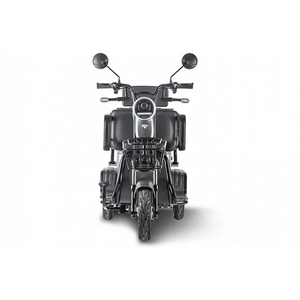При массе трицикла 85 кг грузоподъемность составляет 130 кг. Модель оснащена двигателем мощностью 650 Вт, которое в сочетании с емким АКБ способно выдавать скорость до 25 км/час и преодолевать на одной подзарядке до 30 км пути.