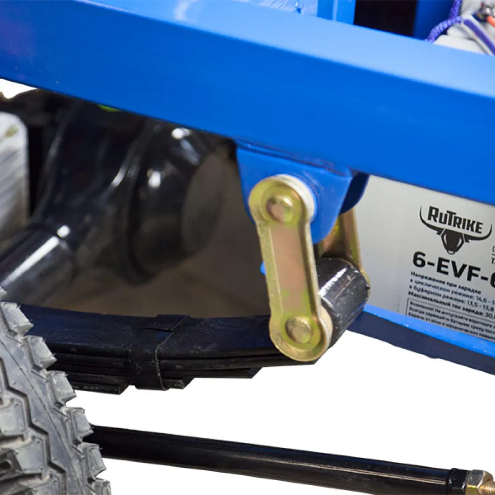 Этот электротрицикл оснащен гидравлическим приводом, что обеспечивает плавное и стабильное управление. Передняя подвеска состоит из усиленных гидравлических амортизаторов, которые обеспечивают комфортную езду даже на неровных поверхностях.