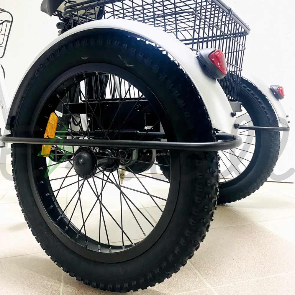 Трицикл имеет мощный электромотор c прямым приводом. Алюминиевая рама оснащена амортизационной вилкой, благодаря которой велосипед сможет преодолеть любые препятствия.