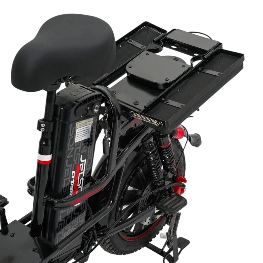 Рама выполнена из стали, что обеспечивает высокую прочность и надёжность, особенно при активной городской эксплуатации и перевозке тяжёлых грузов. Размер рамы составляет около 120 см, а конструкция рулевой колонки – резьбовая, что упрощает обслуживание и регулировку. Вилка пружинно‑масляная, она хорошо сглаживает мелкие неровности асфальта и обеспечивает комфортную езду по городским дорогам и тротуарам. Колёса диаметром 16 дюймов сбалансированы между манёвренностью и устойчивостью, а классические педали позволяют использовать велосипед и в обычном (не только электрическом) режиме.
